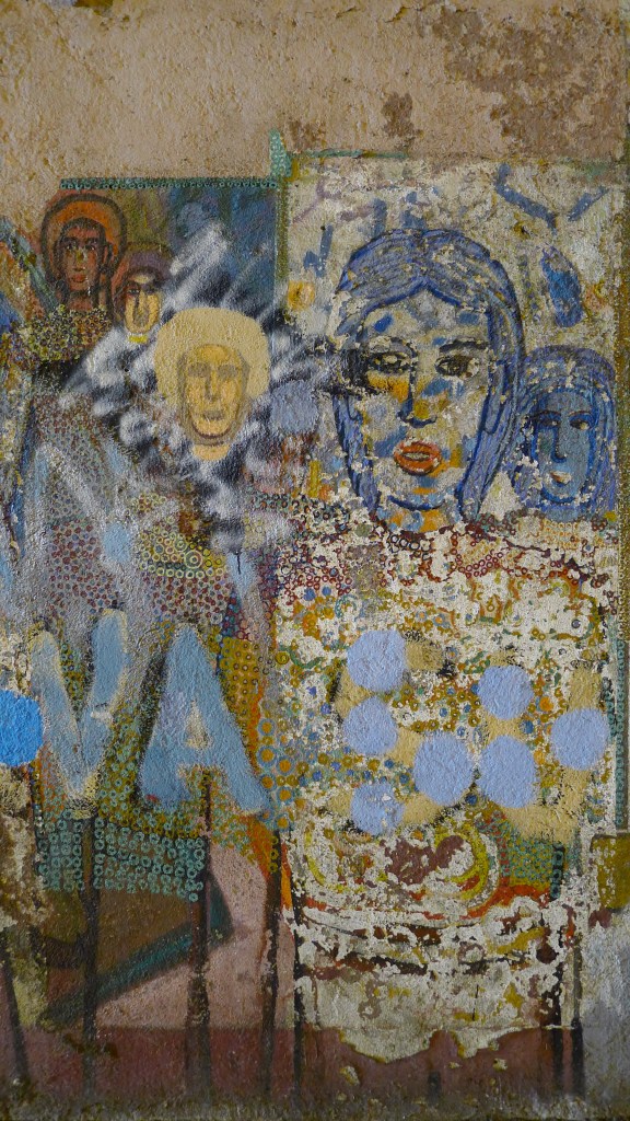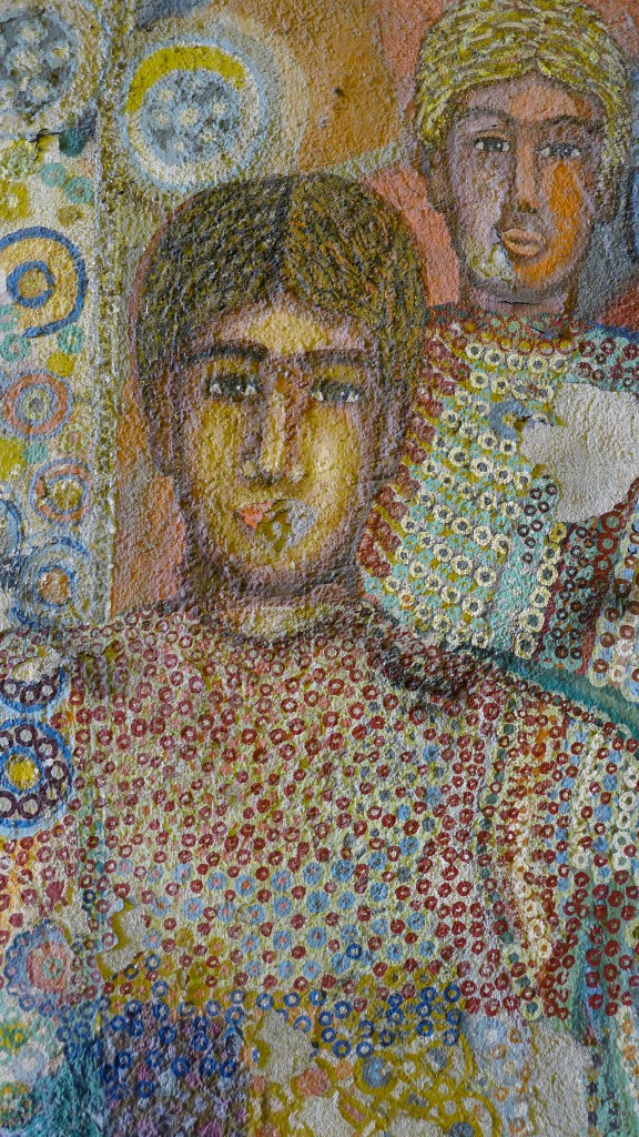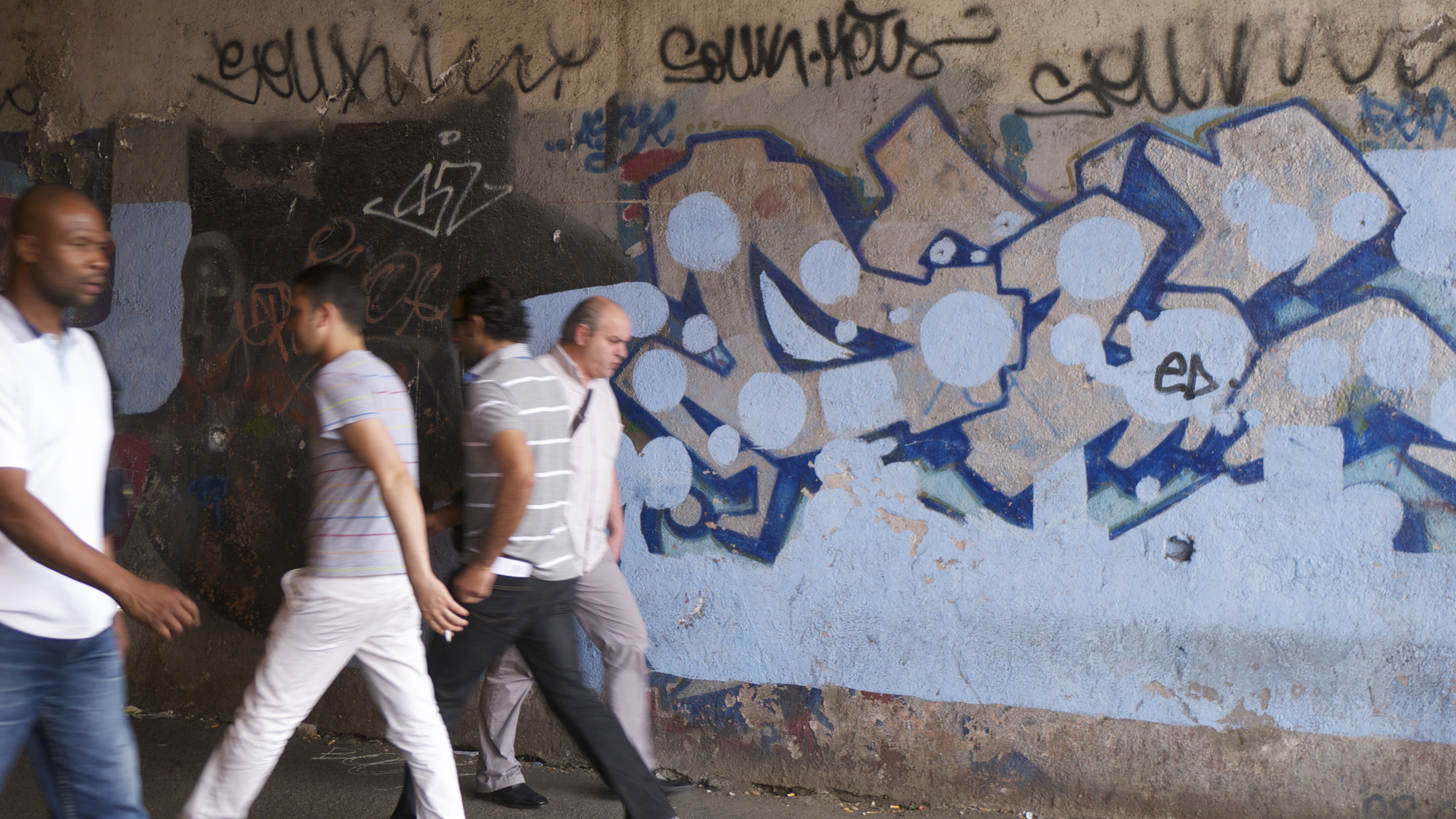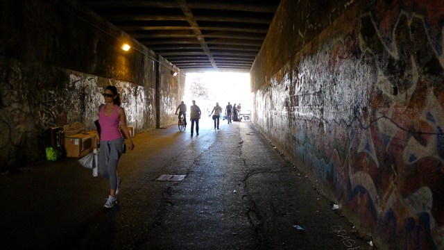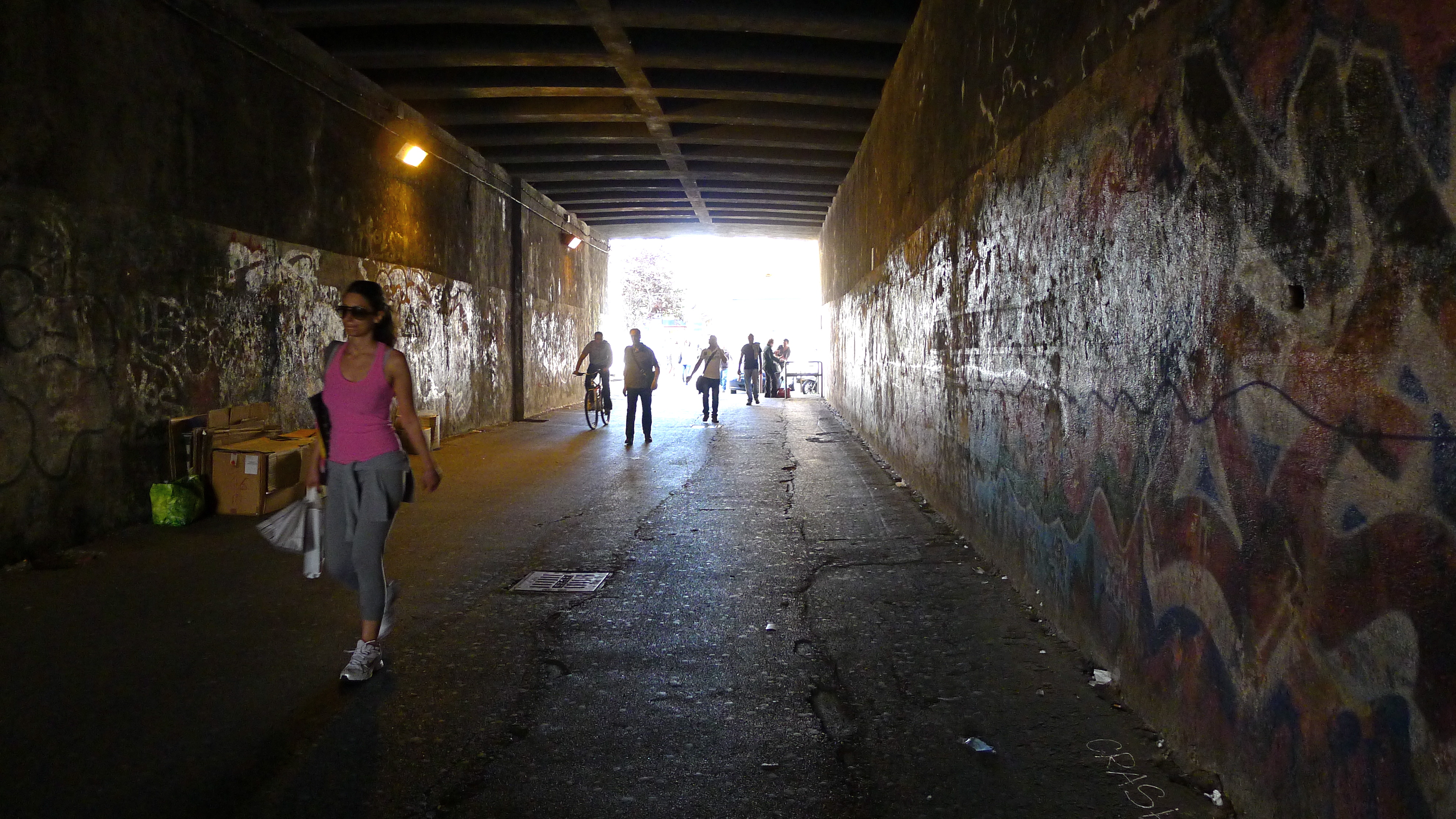 Nous nous engageons dans un tunnel pour piétons long d’une cinquantaine de mètre. De chaque côté, les murs sont couverts de graffitis… Les passants ne les remarquent sans doute plus, ces gribouillis comme on en voit partout. Eh, oui! c’est malheureux, mais à Rome comme ailleurs, on tague beaucoup (mais, encore heureux, rarement sur les monuments…) La plupart du temps, ça ne rime à rien d’autre qu’à dire «Voilà! J’existe et je vous EMMERDE…» Mais parfois, on tombe sur de vrais petits bijoux.