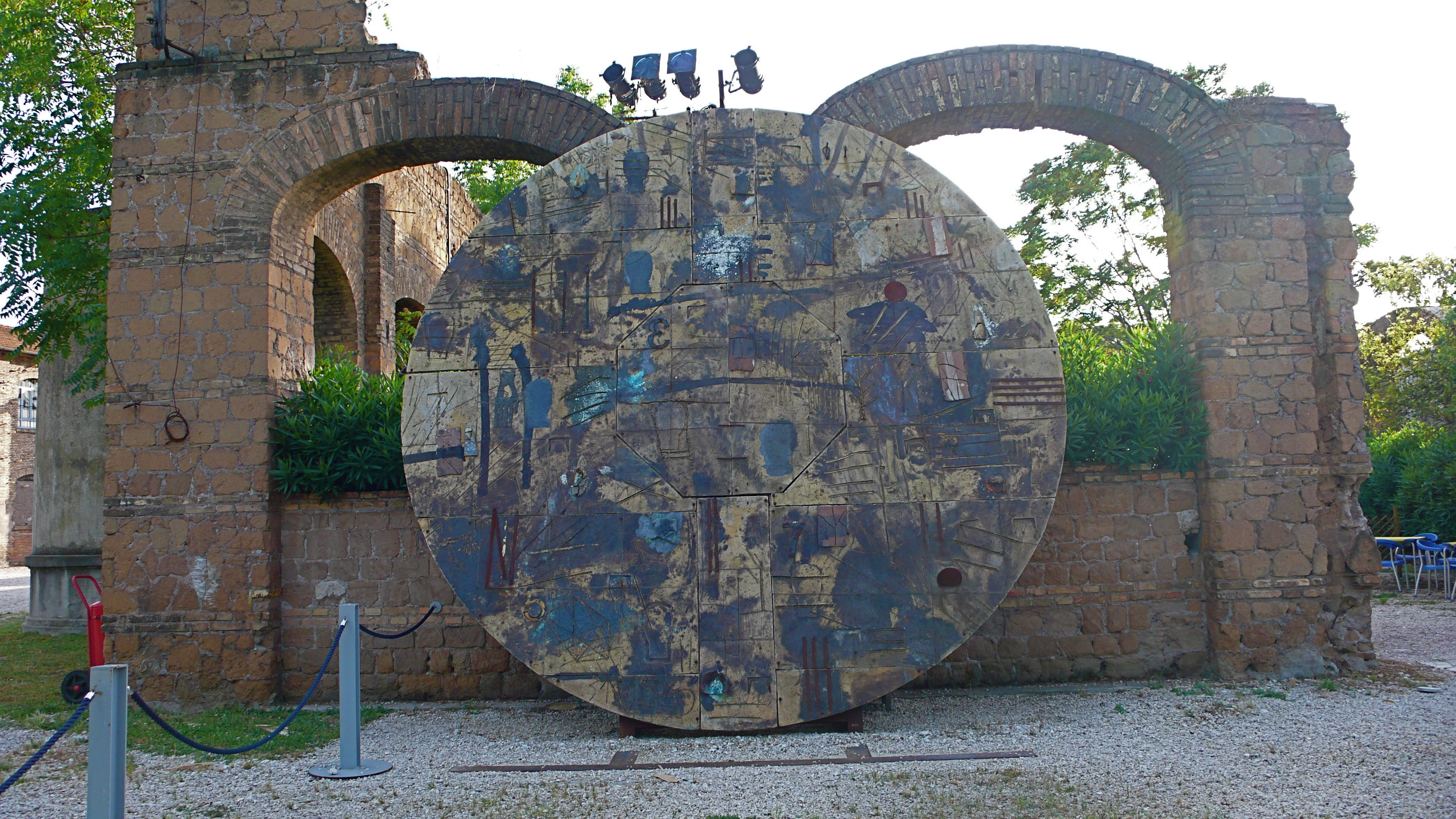 Après de nombreux viraillages apparaît devant nous, à quelques dizaines de mètres, le Gazomètre; à nos pieds, un cours d’eau : nous sommes du mauvais côté du Tevere (le Tibre), en surplomb d’une piste cyclable. Au loin, sur notre gauche, un train passe sur un pont que nous aurions peut-être dû emprunter pour nous rendre sur l’autre rive… En se retournant vers la rue qui nous a amenés là, une curieuse enseigne attire tout à coup notre attention; il s’agit de l’entrée d’un lieu culturel, au beau milieu de ce qui nous semble être une ancienne zone industrielle : le Teatro India…