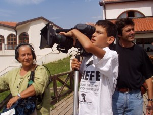 Un moment du tournage à Mostar, avec Philippe Lavalette, Diane Carrière et l’un des enfants qui était si curieux du fonctionnement de la caméra.