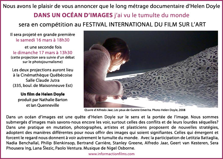 Scénariste et réalisatrice de films documentaires, Helen Doyle vit au Québec, mais ses sujets l'amènent en divers lieux du monde. Avec son complice Germain Bonneau - qui collabore d'ailleurs à ce blog - elle produit certains de ses films à travers les Productions Tatouages de la mémoire