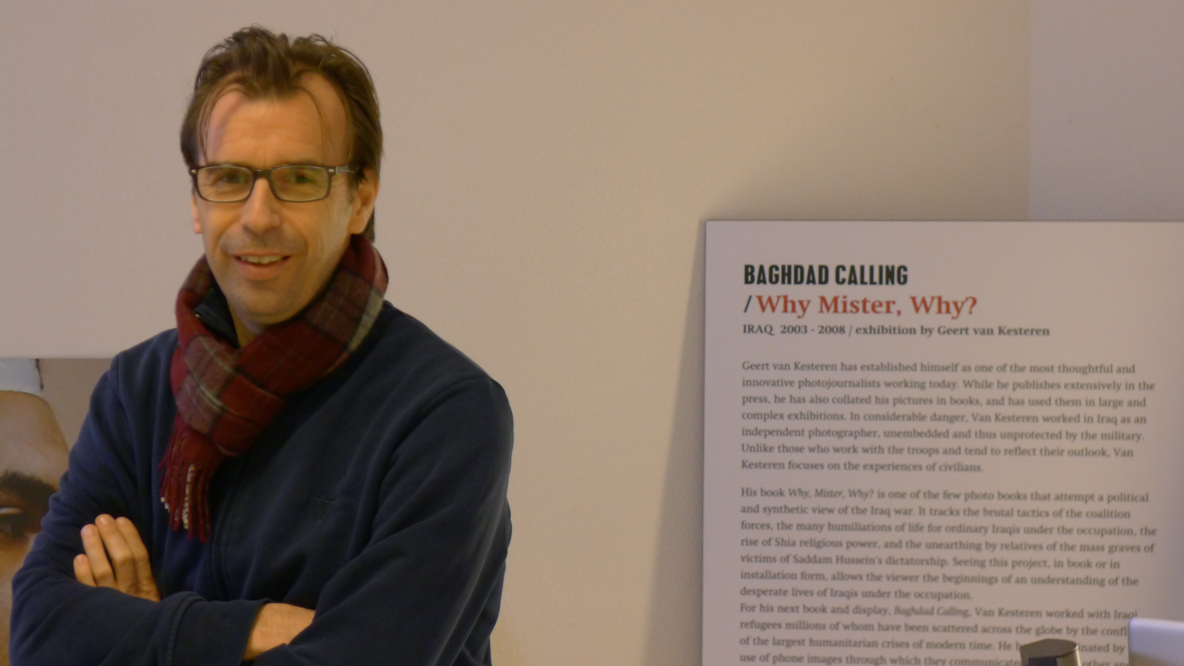 Puis ce sera la rencontre avec Geert Van Kesteren; il nous propose son travail «Why Mister Why ?» sur l’Irak, et aussi son «Bagdad Calling», un projet pensé avec justesse à partir des images faites au moyen de téléphones cellulaires; des images citoyennes. J’avais vu ces images lors d’une exposition à Londres où je m’étais rendue, en fait, pour voir, au Barbican, les photos de Capa et de Gerda Tarot... Dans d’autres salles, à l’étage en dessous, j’avais été impressionnée par l’exposition sur l’Irak et le travail de plusieurs photographes et artistes. Une oeuvre-installation m’avait immensément plu, celle de Omer Fast (que j’avais croisé à Perpignan en 2008). Mais dans une salle, je m’étais retrouvée devant la murale composée de plusieurs photos prises au téléphone cellulaire… Cela m’obséda tant et tant que, n’ayant pu la filmer in situ, avec l’accord de Geert, nous avons reconstitué ce mur virtuellement, grâce à la persévérance de «l’infographiste» Guy Lessard. Geert nous avait aussi fait parvenir des entrevues réalisées par lui…