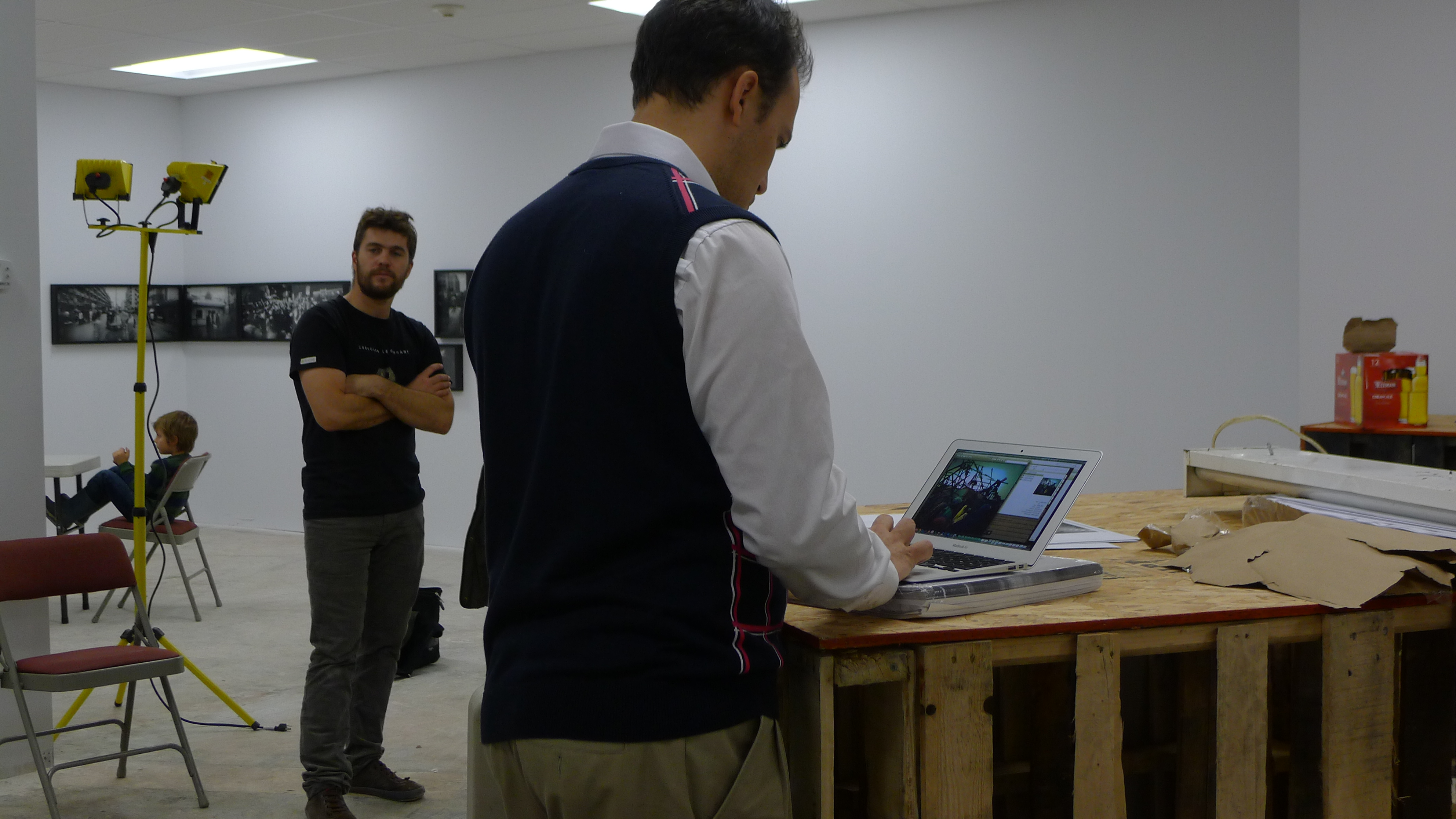 Il y a de la fébrilité dans l’air, des ajustements de dernière minutes, des accrochages qu’on termine; ici Nicolas Lévesque finit d’accrocher In guns we trust.