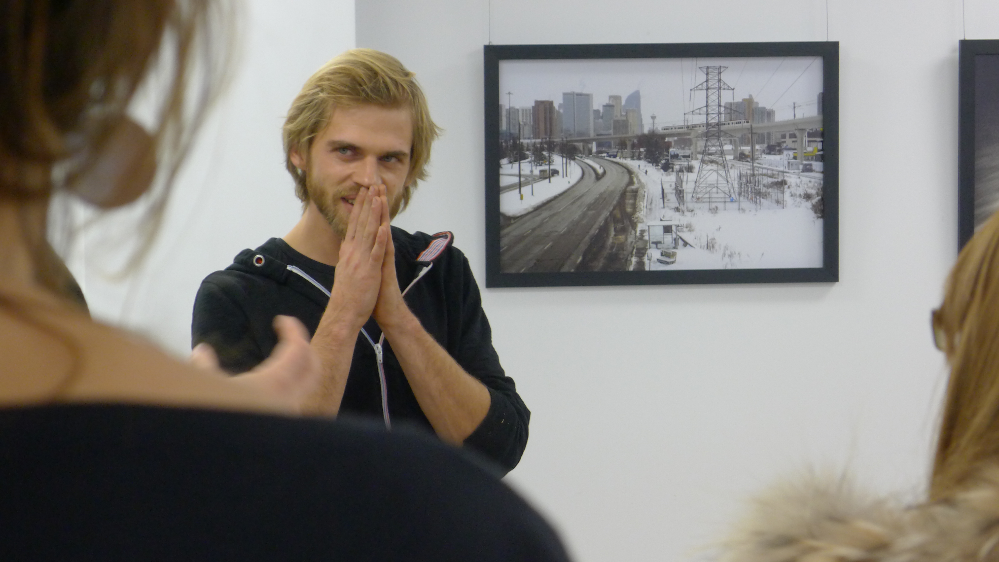 Renaud Philippe, à peine terminé son accrochage de 185 heures, prend le temps d’échanger avec des jeunes étudiants en photographie venus de St-Félicien.