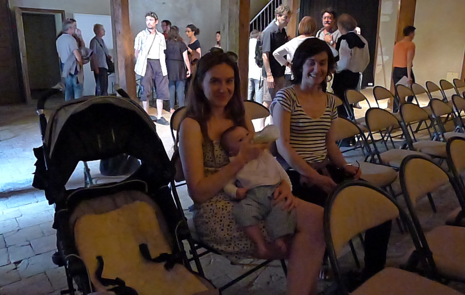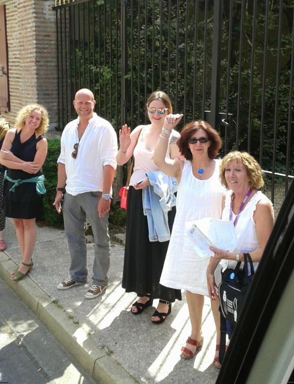 …jusqu’à ce que trois voitures arrivent pour nous prendre en charge : premier contact avec Sophie-Capucine Mermet, l’une des bénévoles à l’accueil des invités, (avec Marion, Margaux, Chantal…)