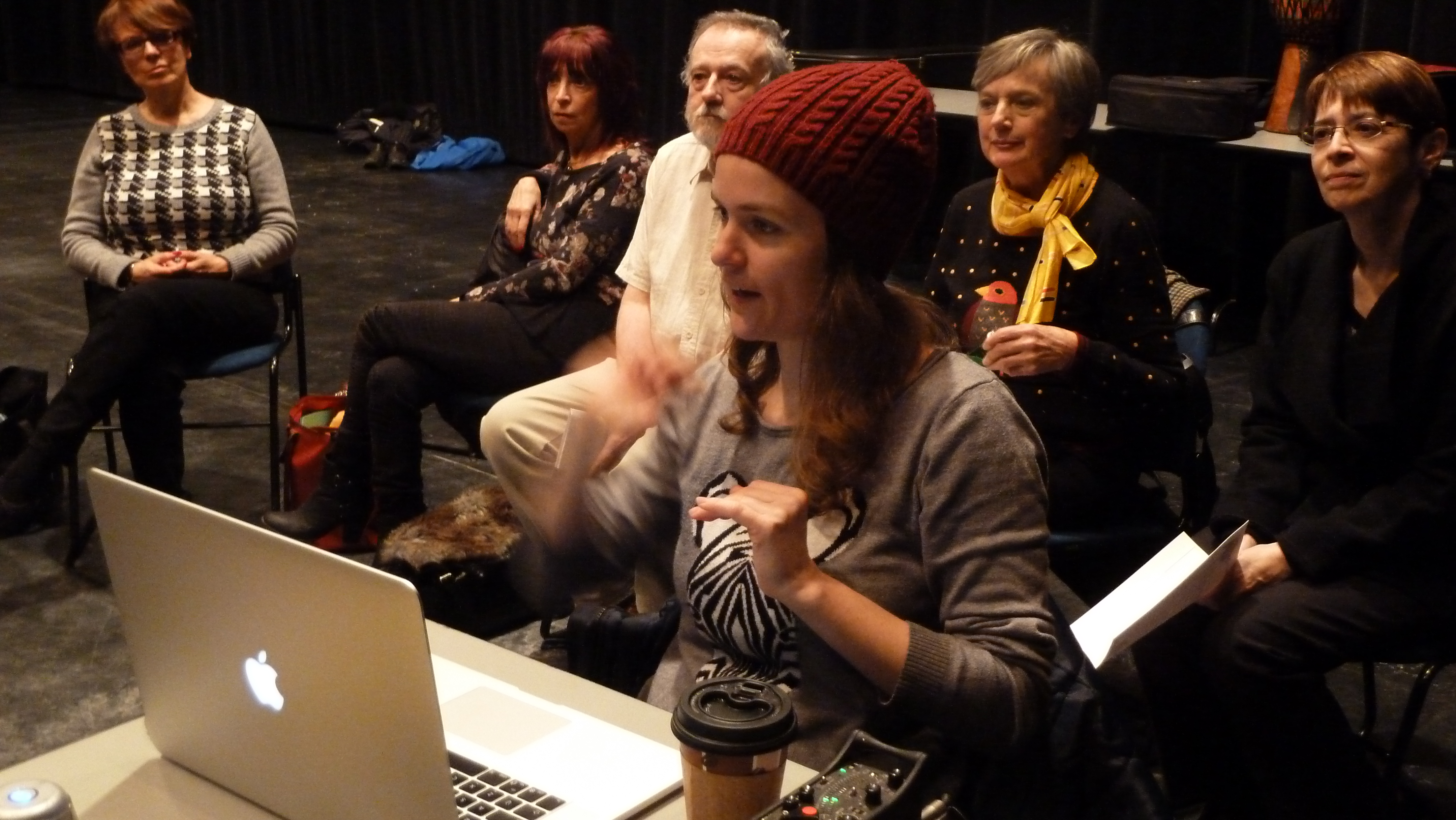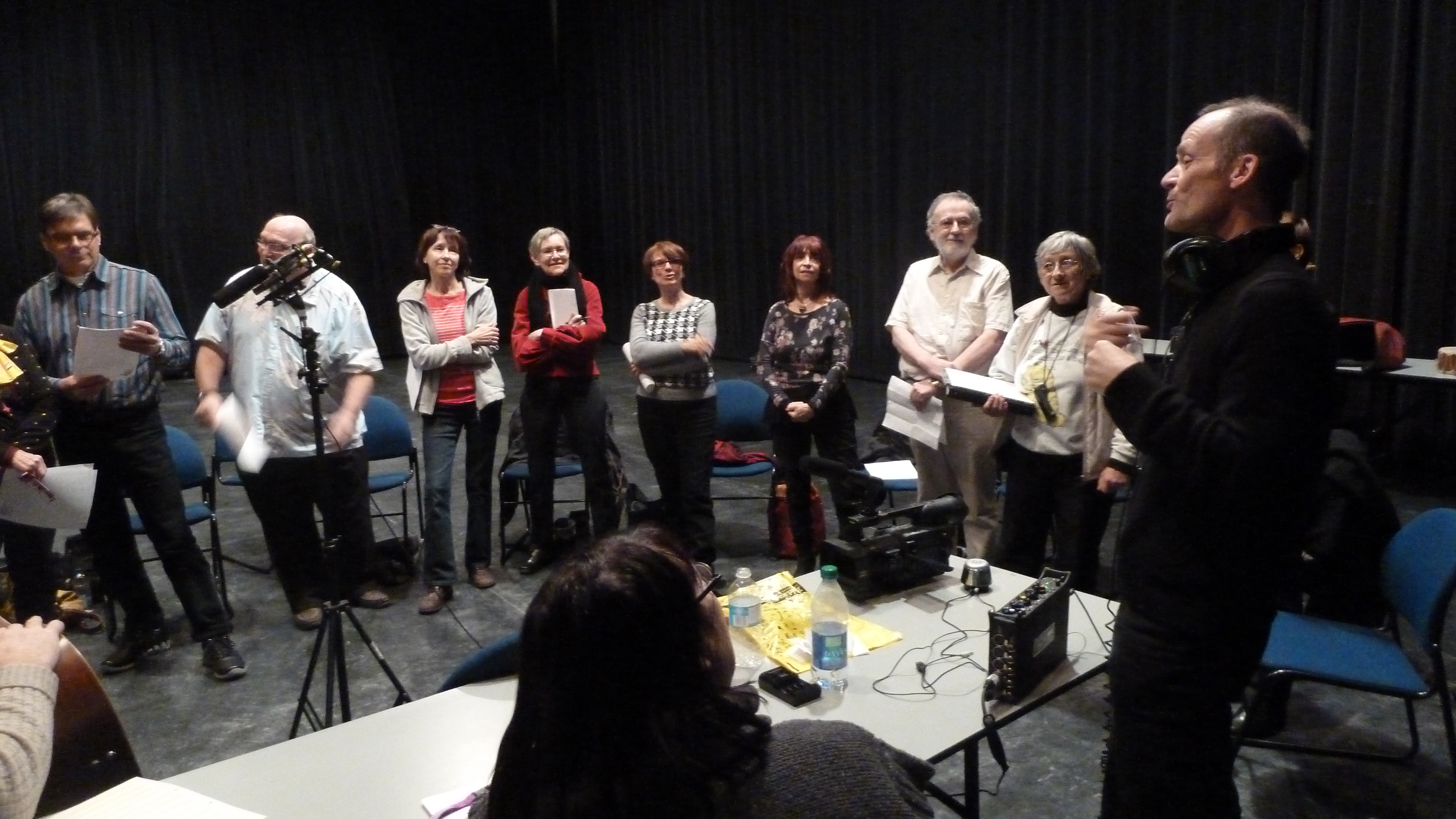Nous avons eu la chance que Nigel trouve le temps de répondre à notre invitation. Je sais que le groupe s’inquiétera pour la suite : trouvera-t-il le moyen de revenir? Tout au long des ateliers, il demandait de la patience et il promettait de petits miracles. La preuve est maintenant là : trois maquettes de chansons et des thèmes musicaux en exploration… Il y a eu aussi une initiation au montage sonore, cette fois-ci grâce à la virtuosité et à la patience de Sophie Guérin qui, sur le piano de son ordinateur et avec des moyens bancals, a pu donner une idée des processus de création. Samedi matin, après quelques retouches et inventions musicales, nous avons pu entendre les résultats de ce travail collectif. Alors, patience; Nigel a dit qu’il reviendra, comme les oies, se poser sur nos battures.