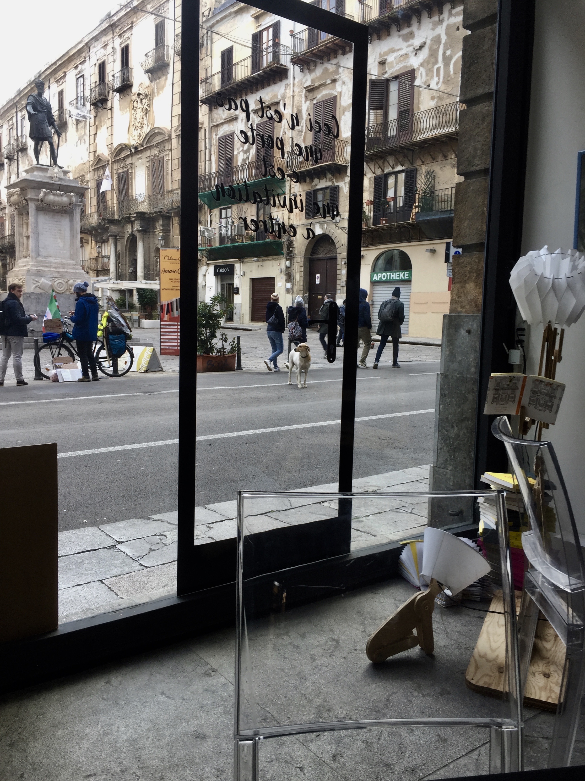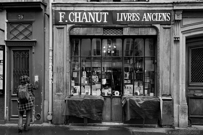 Quelques jours plus tard, après avoir mis le fiancé sur son avion de retour au pays, je me suis mise à chercher – parce que je ne l’avais pas notée – la galerie où j’avais vu ces masques magnifiques ; j’ai enfin pu les retrouver, trônant dans la vitrine d’une libraire de livres anciens, rue Mazarine.